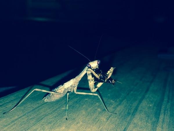 Preying mantis caught a small beetle on our deck and was chomping away. http://t.co/q2zXVzO325