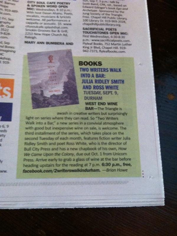 My first reading from the chapbook is tomorrow! @IndyweekArts was kind to shout us out. http://t.co/3ssnmoKAbs